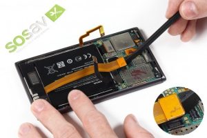 6) در این قسمت از کار تعویض حسگر اثر انگشت گوشی نوکیا، فلت باتری را از روی برد آزاد نمایید،
